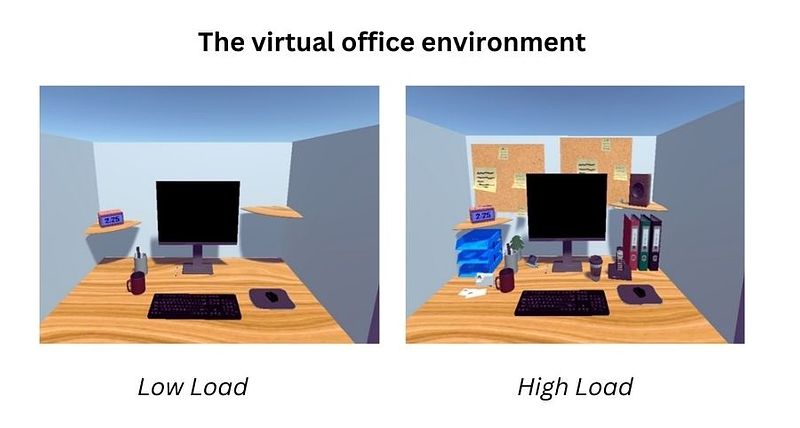 With immersive technologies becoming an integral part of our lives, it is almost certain that in the next few years, we are going to spend much of our daily time (e.g., working) in digital spaces. This calls for the understanding of how the different qualities of digital spaces would affect the users' behavior. Such understanding can be used, for example, to adapt a digital environment to the cognitive state of the user in order to increase their productivity or performance. Influenced by my PhD research, which was about how the organization of spaces affects perception and cognition, and two recent papers (this one and this one), I came up with an idea about a virtual office environment. I developed two variants of this environment, a low-load, and a high-load to use them as a testbed for experimentation. The users are asked to perform various cognitive tasks displayed on the virtual computer screen while their eyes are being tracked. This will give valuable insights into how the organization of a digital working space affects users' information processing abilities and visual behavior. Several extensions can be made from there. For example, specific eye movement metrics can provide information about the cognitive state of the user (e.g., fatigue, distractibility, etc.) and can trigger changes to the working environment or give "smart" recommendations (e.g., you look tired. it might be a good idea to have some rest). These types of digital applications hold great promise for the future of human-centered context-aware computing!